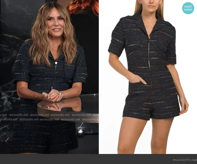 Keltie Knight on E! News on E! was spotted wearing this black tweed romper on E! News on Nov 05 2024's episode. Keltie's Romper is the Tweed Playsuit by Sandro.