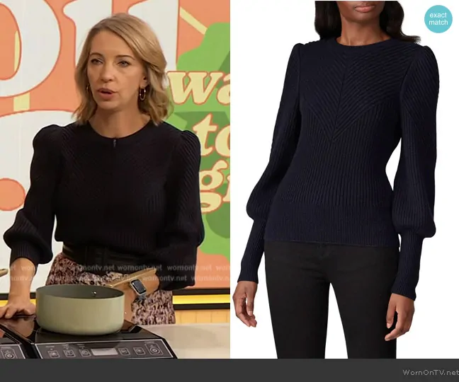 on The Drew Barrymore Show on CBS was spotted wearing this black ribbed puff sleeve sweater and skirt on The Drew Barrymore Show on Nov 05 2024's episode. 's Sweater is the Ronita Sweater by Joie . 's Skirt is the Vlissa Leopard Print Skirt by BOSS.