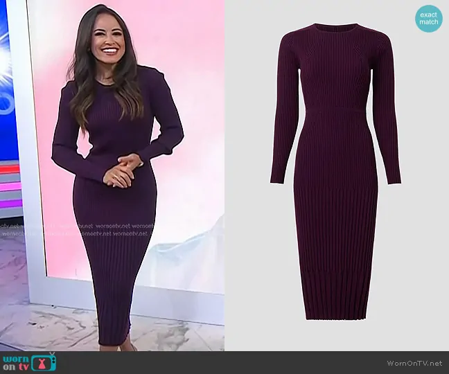 Kaylee Hartung on Today on NBC was spotted wearing this purple ribbed sweater dress on Today on Nov 05 2024's episode. Kaylee's Dress is the Sweater Sheath Dress by Jason Wu Collective.