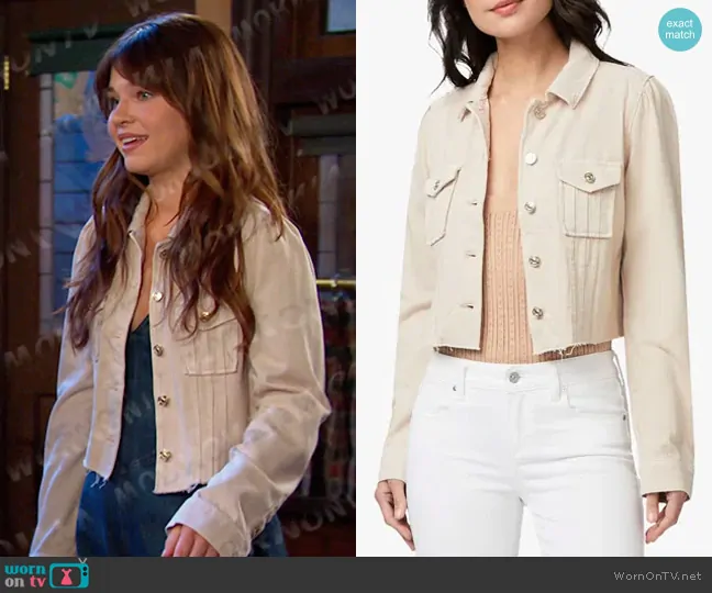Joy Wesley (played by AlexAnn Hopkins) on Days of our Lives on Peacock was spotted wearing this beige denim jacket and jumpsuit on Days of our Lives on Nov 07 2024's episode. Joy's Jacket is the Pacey Raw Hem Crop Twill Jacket in Soft Beige by Paige . Joy's Jumpsuit is the Match Point Jumpsuit by We The Free . Joy's Bag is the Asymmetric Crossbody Bag by Zara.
