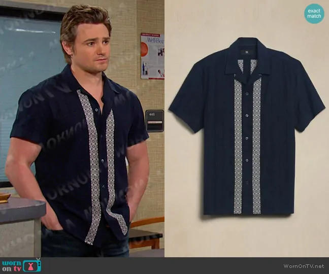Johnny DiMera (played by Carson Boatman) on Days of our Lives on Peacock was spotted wearing this navy print panel shirt on Days of our Lives on Nov 08 2024's episode. Johnny's Shirt is the Summerland Jacquard Resort Shirt by Banana Republic.