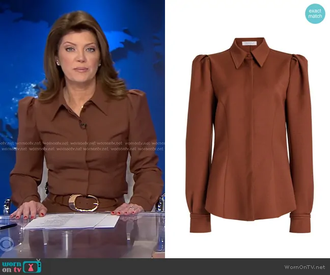 Norah O'Donnell on CBS Evening News on CBS was spotted wearing this brown shirt and flare pants on CBS Evening News on Nov 08 2024's episode. Norah's Top is the Talbot Shirt in Cognac Sportswear Wool by Gabriela Hearst . Norah's Pants is the Rhein Pant in Cognac Sportswear Wool by Gabriela Hearst . Norah's Belt is the Lozewce Belt in Cognac Leather by Gabriela Hearst.