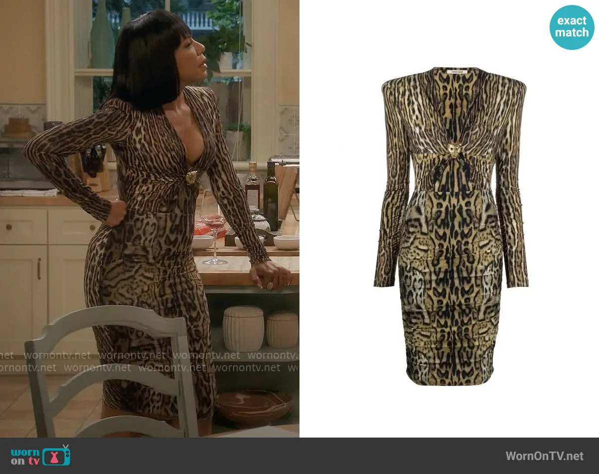 Catherine (played by Wendy Raquel Robinson) on Poppas House on CBS was spotted wearing this leopard print dress on Poppas House on episode 'School Days' (1x04) in Nov 2024. Catherine's Dress is the Ocelot-Print Ruched Dress by Roberto Cavalli.