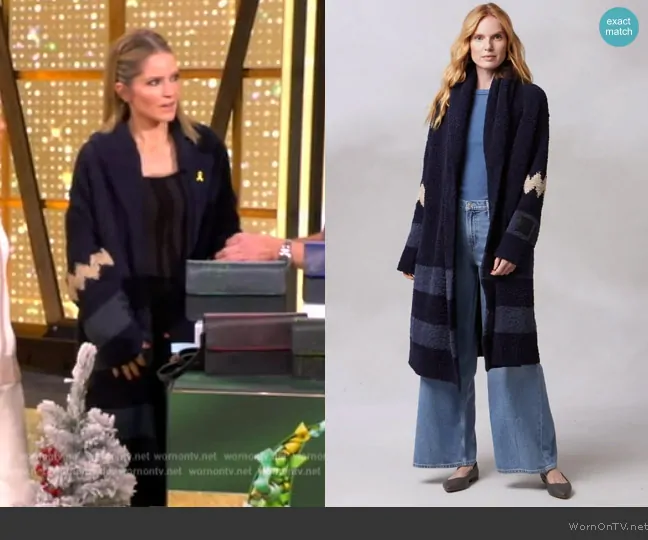Sara Haines on The View on ABC was spotted wearing this blue cashmere cardigan on The View on Nov 11 2024's episode. Sara's Coat is the Shawl Collar Coat by Kashwere.