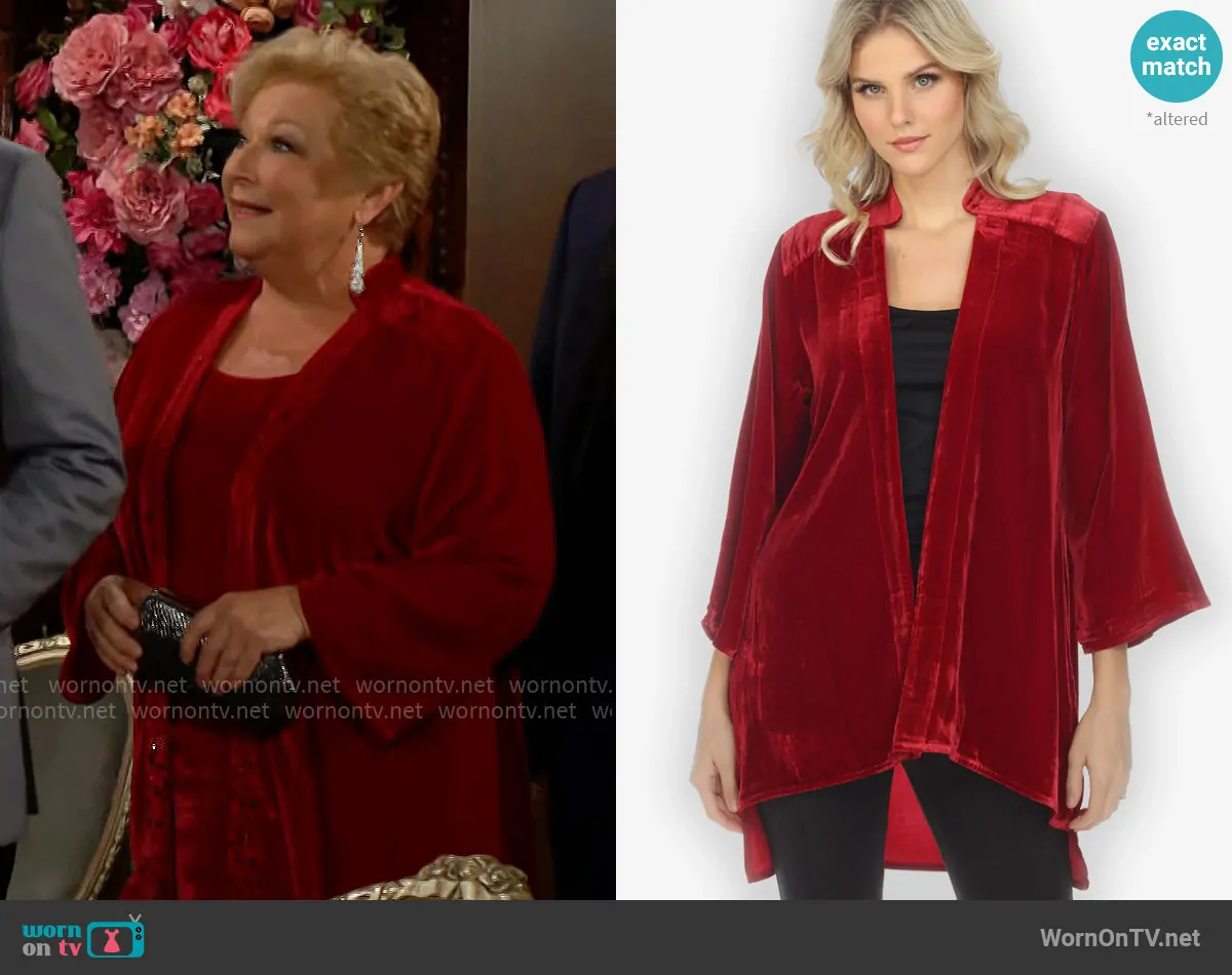 Traci Abbott (played by Beth Maitland) on The Young and the Restless on CBS was spotted wearing this red velvet kimono jacket on The Young and the Restless on Nov 12 2024's episode. Traci's Jacket is the Silk Blend Velvet Kimono by Citron.