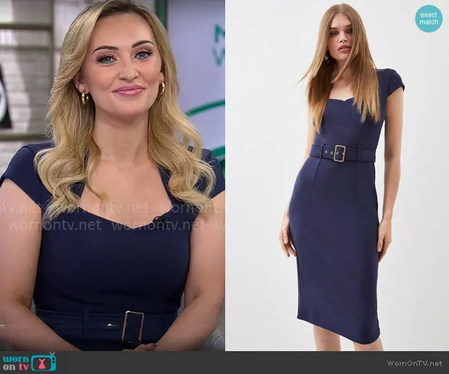 Kelly O'Grady on CBS Mornings on CBS was spotted wearing this navy belted sheath dress on CBS Mornings on Aug 26 2025's episode. Kelly's Dress is the Cap Sleeve Scuba Crepe Belted Midi Pencil Dress by Karen Millen .