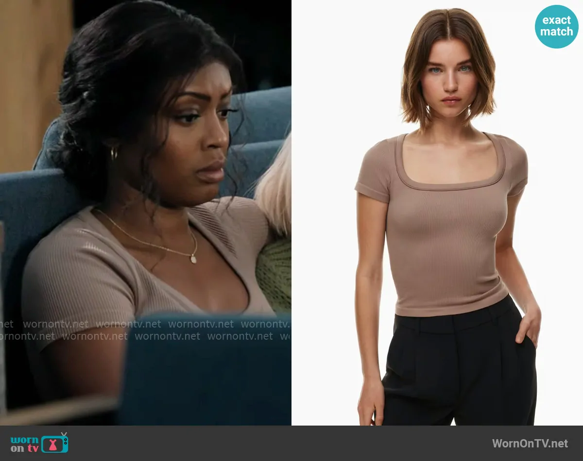 Daphne (played by Javicia Leslie) on High Potential on Hulu was spotted wearing this taupe scoop-neck top and cropped blazer on High Potential on episode 'One of Us' (1x07) in Nov 2024. Daphne's Top is the Rib seamless willow squareneck t-shirt in Deep Taupe by Seamless at Aritzia . Daphne's Jacket is the Arbus blazer by Babaton at Aritzia.