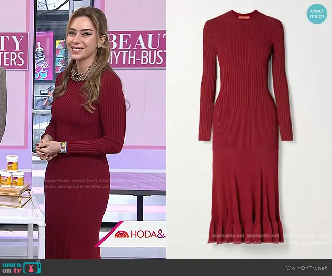 on Today on NBC was spotted wearing this red ribbed dress on Today on Nov 15 2024's episode. 's Dress is the Seyrig Ribbed-knit Midi Dress by Altuzarra.