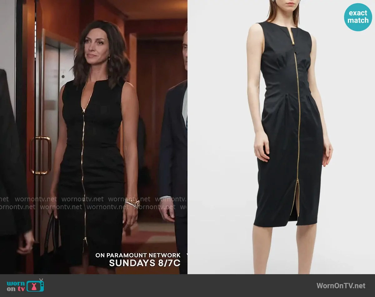 Sarah Atwood (played by Dawn Olivieri) on Yellowstone on Paramount was spotted wearing this black zip-front dress and grommet trim bra on Yellowstone on episode 'The Apocalypse of Change' (5x10) in Nov 2024. 's Dress is the Sleeveless Zip-Front Midi Dress by Carolina Herrera . 's Bra is the Playground Triangle Bra by Livy.