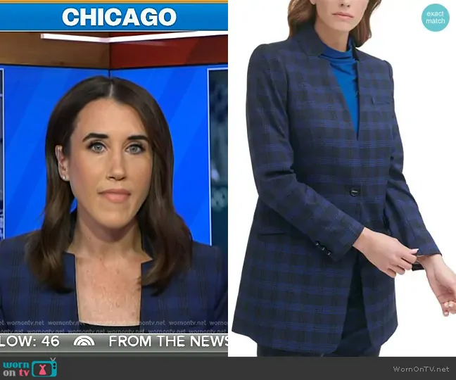 Maggie Vespa on Today on NBC was spotted wearing this Maggie’s blue checked blazer on Today on Nov 18 2024's episode. Maggie's Jacket is the One-Button Plaid Blazer by DKNY.