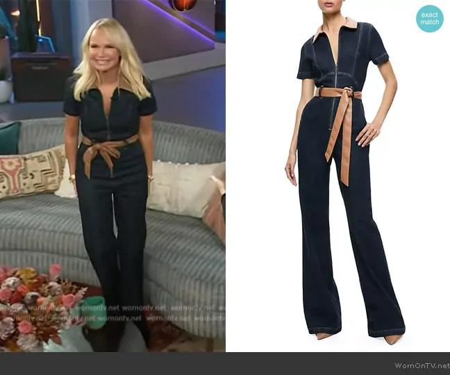 on The Kelly Clarkson Show on NBC was spotted wearing this denim contrast belted jumpsuit on The Kelly Clarkson Show on Nov 18 2024's episode. 's Jumpsuit is the Gorgeous Denim Tie-Waist Jumpsuit by Alice + Olivia.