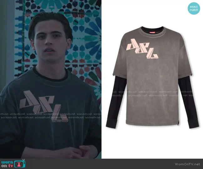 Robby Keene (played by Tanner Buchanan) on Cobra Kai on Netflix was spotted wearing this grey print layered tee on Cobra Kai on episode 'Benvinguts a Barcelona' (6x06) in Nov 2024. Robby's Shirt is the Double Layer T-Wasy T-Shirt With Distressed Effect in Grey by Diesel.