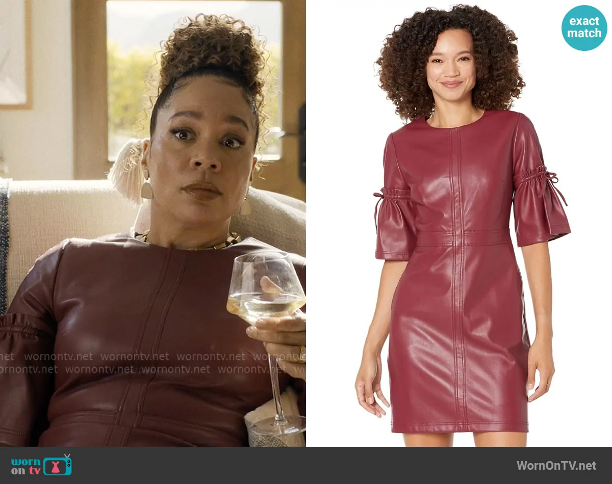 Carolyn (played by Aisha Alfa) on Based on a True Story on Peacock was spotted wearing this burgundy leather dress on Based on a True Story on episode 'Liquid Gold' (2x01) in Nov 2024. Carolyn's Dress is the Mini Elbow Sleeve Ruffle Tie Round Neck Bodycon Dress by Bcbgmaxazria.