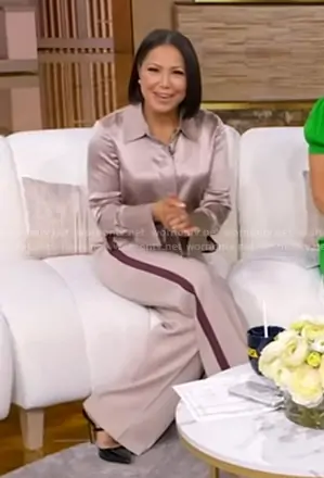 Stephanie Ramos on Good Morning America on ABC was spotted wearing this wide cuff silk shirt and side stripe pants on Good Morning America on Oct 02 2025's episode. Stephanie's Top is the Hailey Silk Buttoned Shirt in Champagne by Reiss . Stephanie's Pants is the Isla Wide-Leg Striped Trousers in Stone by Reiss.