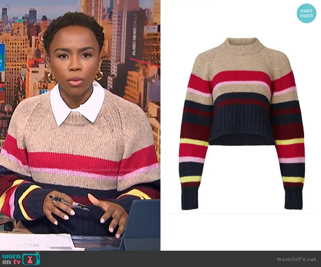 Zinhle Essamuah on NBC News Daily on NBC was spotted wearing this multicolor striped knit sweater on NBC News Daily on Nov 25 2024's episode. Zinhle's Sweater is the The Moonshine Sweater by Current/Elliott.