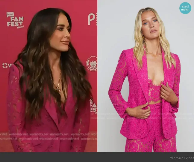on Access Hollywood on NBC was spotted wearing this Kyle Richards’ pink lace blazer and pants on Access Hollywood on Nov 25 2024's episode. 's Blazer is the Chamberlain Lace Blazer by L'Agence . 's Pants is the Livvy Lace Trouser by L'Agence.