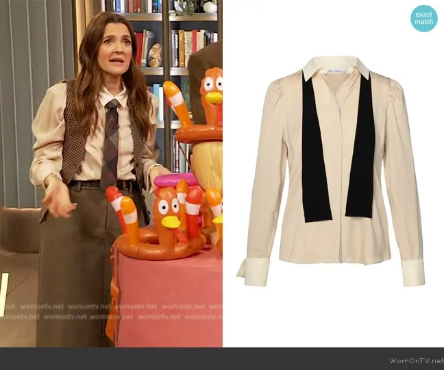 Drew Barrymore on The Drew Barrymore Show on CBS was spotted wearing this check vest and blouse on The Drew Barrymore Show on Nov 26 2024's episode. Drew's Top is the Button Detailed Long-Sleeved Blouse by Max Mara . Drew's Vest is the Andrea Vest in Wool Houndstooth by Giuliva . Drew's Skirt is the Carolina Midi Skirt by Rails.