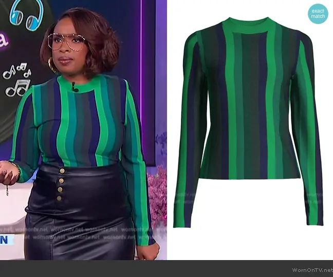 Jennifer Hudson on The Jennifer Hudson Show on FOX was spotted wearing this green striped top and leather skirt on The Jennifer Hudson Show on Nov 27 2024's episode. Jennifer's Top is the The Bert Multi Stripe Sweater by Undra Celesteny . Jennifer's Skirt is the Charice Skirt by Heartloom.