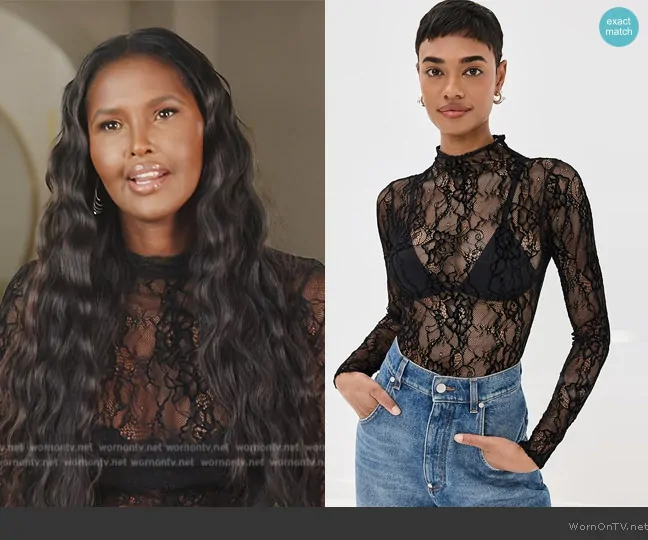 Ubah Hassan on The Real Housewives of New York City on Bravo was spotted wearing this black lace top on The Real Housewives of New York City on episode 'Coming Clean' (15x09) in Nov 2024. Ubah's Top is the Lace Long-Sleeve Bodysuit by Good American.