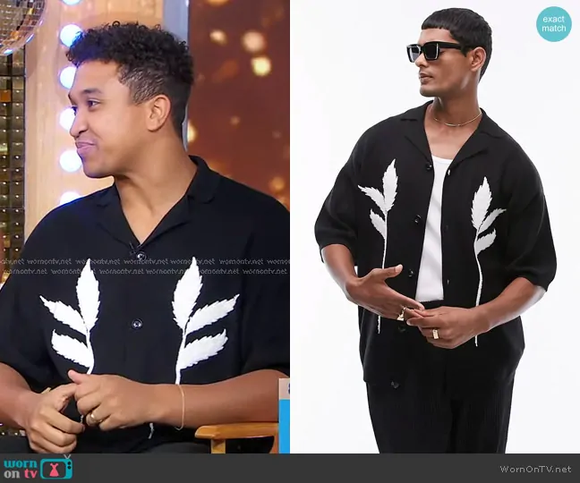on Good Morning America on ABC was spotted wearing this black leaf embroidered shirt on Good Morning America on Nov 27 2024's episode. 's Shirt is the Floral Embroidered Short Sleeve Milano Stitch Camp Shirt by Topman.