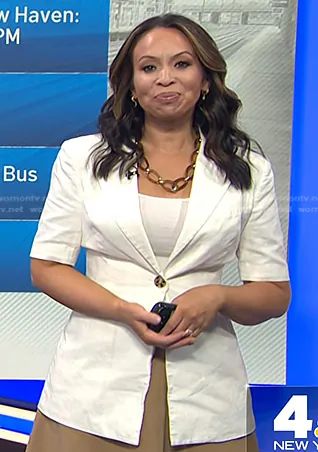 Adelle Caballero on Today on NBC was spotted wearing this white short sleeve blazer on Today on Nov 27 2024's episode. Adelle's Jacket is the Short Sleeve Linen Blazer by Eudon Choi Collective.