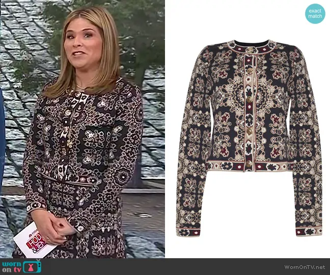 Jenna Bush Hager on Today on NBC was spotted wearing this grey printed cardigan and skirt on Today on Nov 27 2024's episode. Jenna's Jacket is the Livi Jacket in Grey Maroon Rita Tile by Cara Cara . Jenna's Skirt is the Tiffany Skirt in Grey Maroon Rita Tile by Cara Cara.