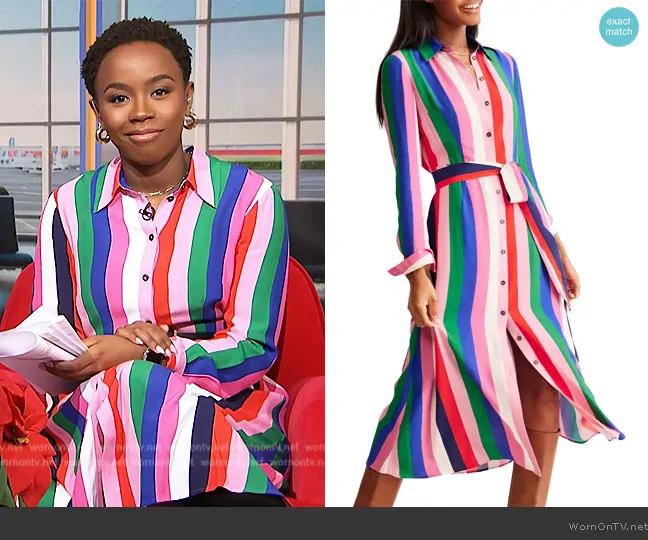 Zinhle Essamuah on NBC News Daily on NBC was spotted wearing this striped shirtdress on NBC News Daily on Feb 06 2025's episode. Zinhle's Dress is the Kate Tie Belt Long Sleeve Shirtdress by Boden.