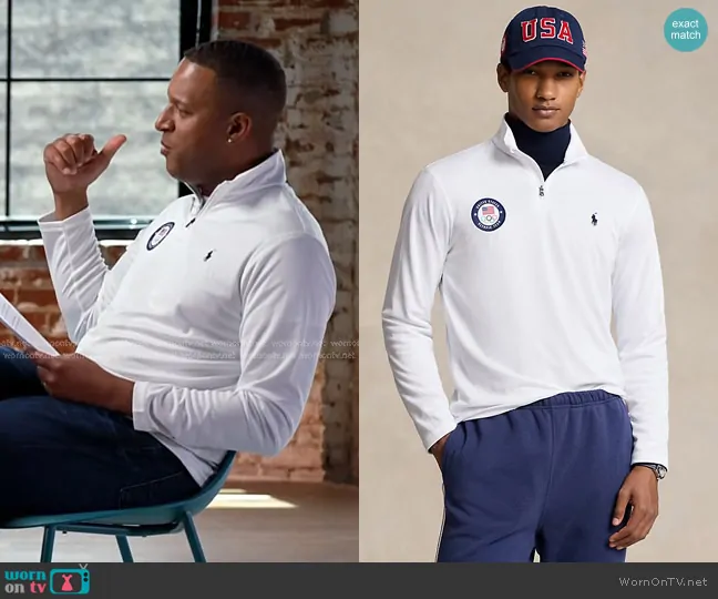 Craig Melvin on Today on NBC was spotted wearing this white half zip sweatshirt on Today on Nov 29 2024's episode. Craig's Sweater is the Team USA Micro-Dot Mesh Pullover by Polo Ralph Lauren.