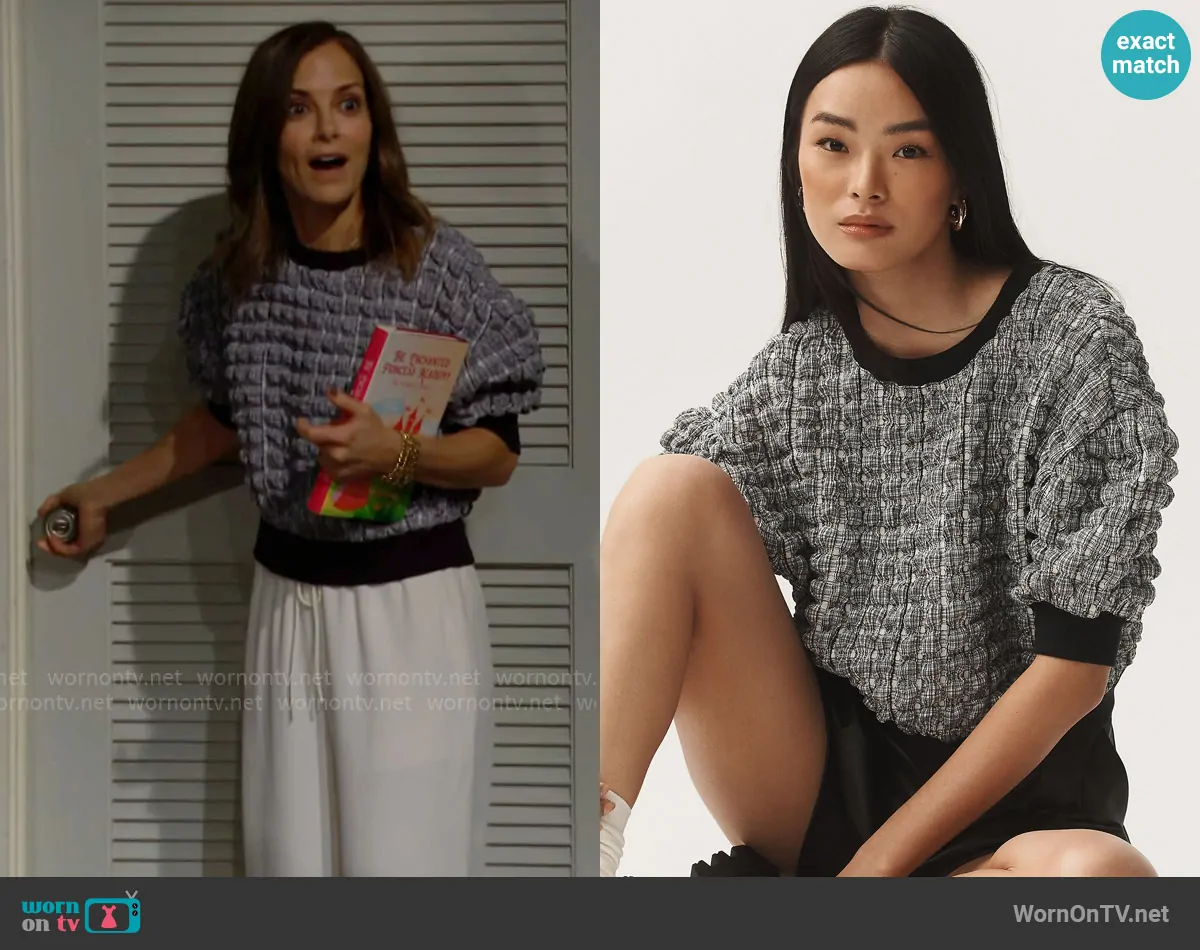 Taylor Hayes (played by Rebecca Budig) on The Bold and the Beautiful on CBS was spotted wearing this black and white waffle texture top on The Bold and the Beautiful on Jun 16 2025's episode. Taylor's Top is the Puff-Sleeve Bubble Top by Maeve at Anthropologie .