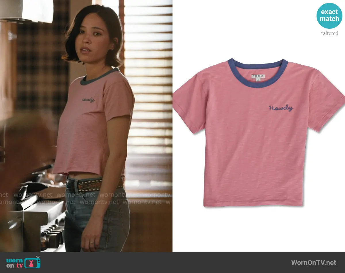 Monica Dutton (played by Kelsey Asbille) on Yellowstone on Paramount was spotted wearing this pink Howdy t-shirt on Yellowstone on episode 'Counting Coup' (5x12) in Dec 2024. Monica's Top is the Vintage Ringer Tee in Dusty Pink / Bluefin by Tecovas .