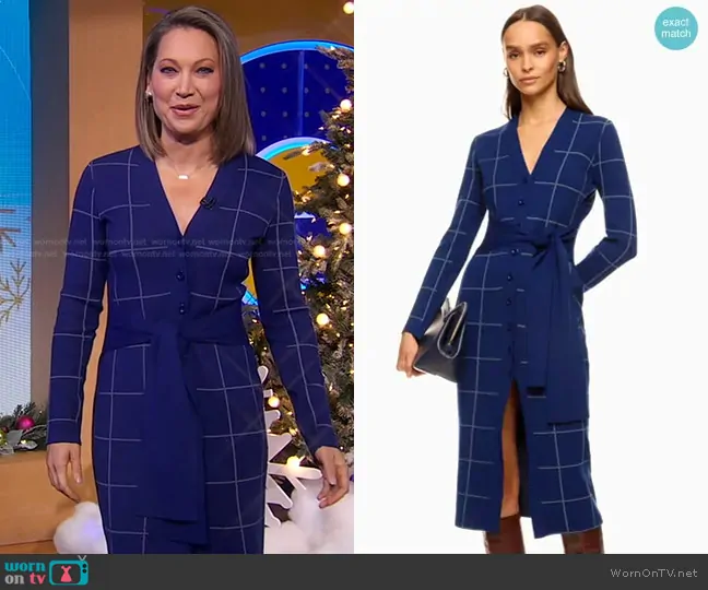 Ginger Zee on Good Morning America on ABC was spotted wearing this blue windowpane dress on Good Morning America on Dec 02 2024's episode. Ginger's Dress is the Windowpane Cardigan Dress by Toccin x RTR.