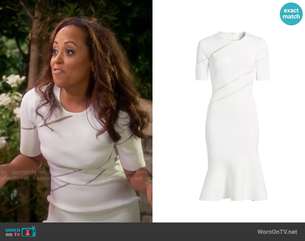 Ivy Reed (played by Essence Atkins) on Poppas House on CBS was spotted wearing this white diagonal stripe dress on Poppas House on episode 'Family Photo' (1x06) in Dec 2024. Ivy's Dress is the Beth Sheer Stripe Fluted Dress by Herve Leger.