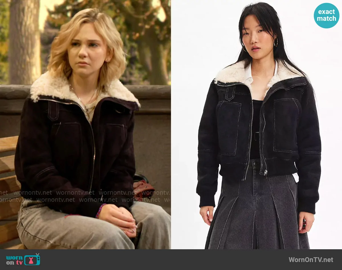 Lucy Romalotti (played by Lily Brooks O’ Briant) on The Young and the Restless on CBS was spotted wearing this black fleece lined jacket on The Young and the Restless on Dec 03 2024's episode. Lucy's Jacket is the August Faux Suede Bomber Jacket by BDG at Urban Outfitters .