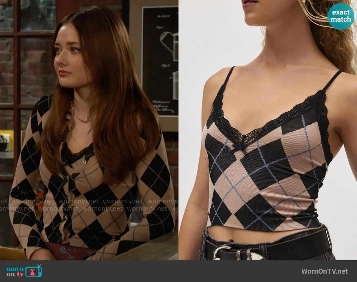 Faith Newman (played by Reylynn Caster) on The Young and the Restless on CBS was spotted wearing this argyle print cardigan and floral maxi skirt on The Young and the Restless on Dec 03 2024's episode. Faith's Top is the Jacquard Seamless Tank Top by Out From Under at Urban Outfitters . Faith's Sweater is the Long Sleeve Argyle Cardigan by iets frans . Faith's Skirt is the Floral Mesh Low Rise Column Maxi Skirt in Brown Multi by Urban Outfitters.
