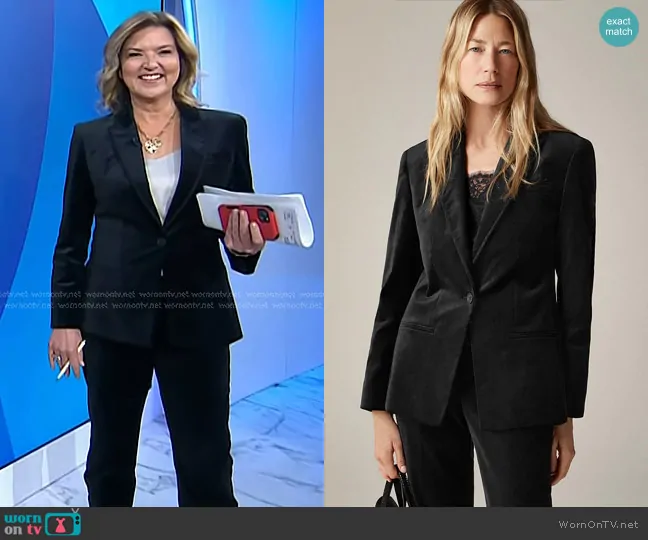 Christine Romans on Today on NBC was spotted wearing this black velvet blazer and pants on Today on Feb 07 2025's episode. Christine's Jacket is the Alexandra Blazer in velvet by J. Crew . Christine's Pants is the Kate Slim-fit Pant in velvet by J. Crew.