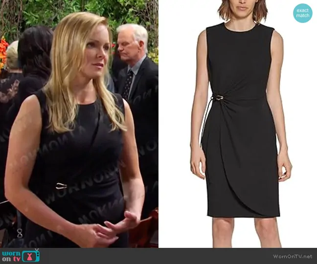 Belle Brady (played by Martha Madison) on Days of our Lives on Peacock was spotted wearing this black sleeveless dress on Days of our Lives on Dec 04 2024's episode. Belle's Dress is the Scuba Crepe Dress with Side Tie Detail by Calvin Klein.