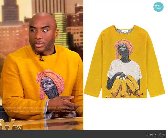 on The View on ABC was spotted wearing this yellow graphic sweater on The View on Dec 04 2024's episode. 's Sweater is the Lady Makola Sweater by Kwasi Paul.