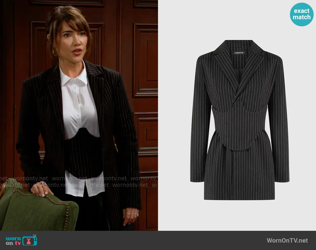 Steffy Forrester (played by Jacqueline MacInnes Wood) on The Bold and the Beautiful on CBS was spotted wearing this pinstripe blazer and corset on The Bold and the Beautiful on Dec 04 2024's episode. Steffy's Set is the Pinstripe Blazer Dress with Reversible Corset by Maniere de Voir.