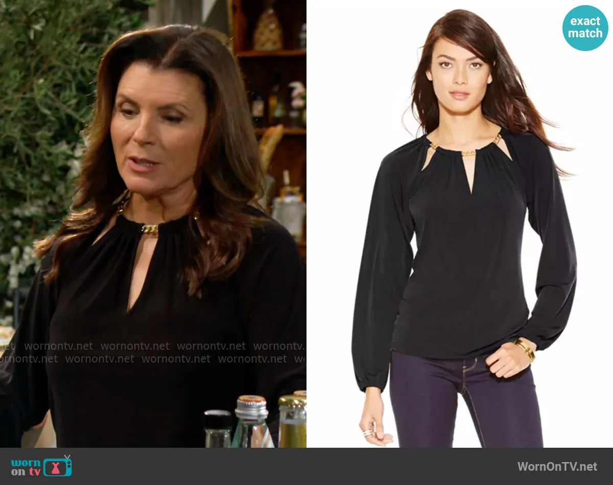 Sheila Carter (played by Kimberlin Brown) on The Bold and the Beautiful on CBS was spotted wearing this black chain detail top on The Bold and the Beautiful on Oct 30 2025's episode. Sheila's Top is the Cutout Chain-Link Top by MICHAEL Michael Kors .