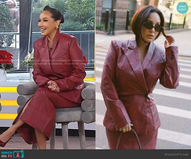 on Today on NBC was spotted wearing this red leather blazer and skirt on Today on Dec 06 2024's episode. 's Jacket is the Leather Mademoiselle Le Blazer in Cherry Wine Leather by La Voute . 's Skirt is the Leather Madame Le Blazer in Cherry Wine Leather by La Voute.