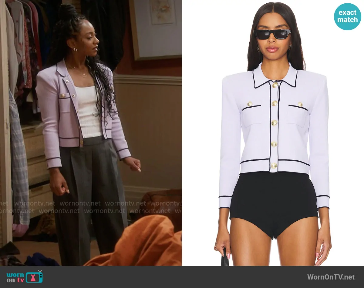 Nina (played by Tetona Jackson) on Poppas House on CBS was spotted wearing this lilac cardigan and grey pleated pants on Poppas House on episode 'Brokeback' (1x07) in Dec 2024. Nina's Sweater is the Neo Cont Trim Crop Cardi in Pale Lilac / Midnight by L'Agence . Nina's Pants is the Charles Trousers in Grey Melange by A.L.C..