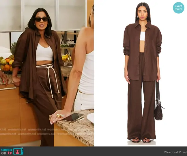 Jessel Taank on The Real Housewives of New York City on Bravo was spotted wearing this brown linen top and pants on The Real Housewives of New York City on episode 'Resorting to Madness' (15x11) in Dec 2024. Jessel's Top is the Linen Woven Shirt by Aexae . Jessel's Pants is the Linen Drawstring Trouser by Aexae.