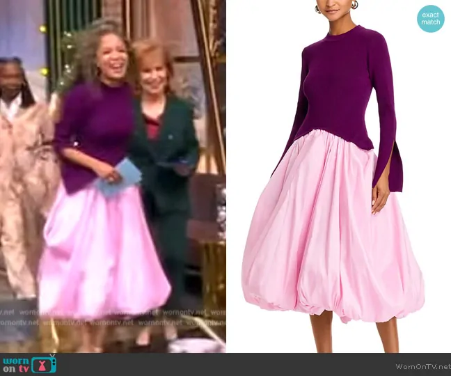 Sunny Hostin on The View on ABC was spotted wearing this purple mixed media dress on The View on Dec 11 2024's episode. Sunny's Dress is the Kenlie Mock Neck Midi Dress by Simkhai.