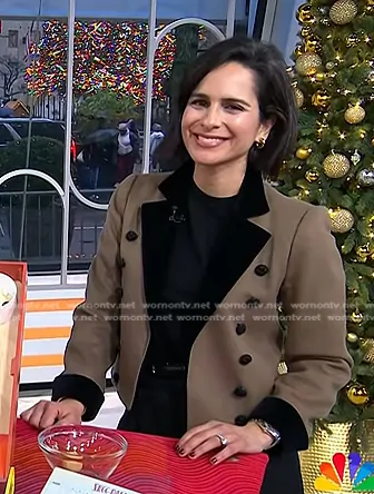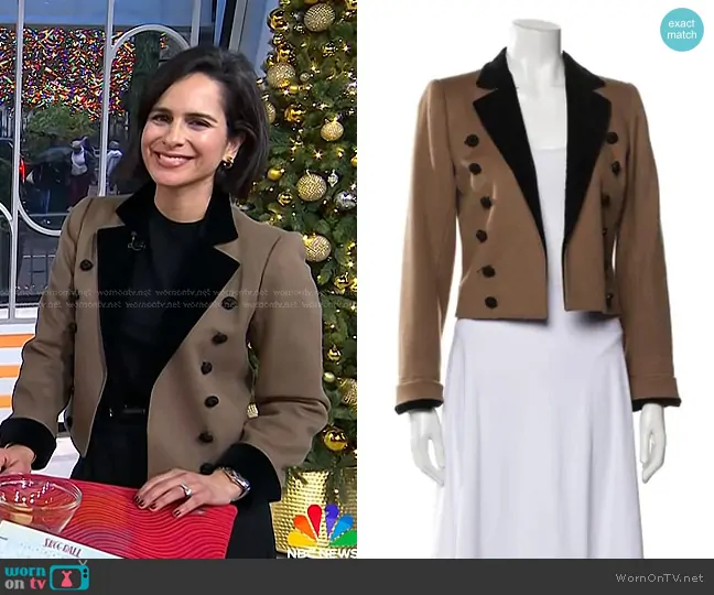on Today on NBC was spotted wearing this brown contrast lapel blazer on Today on Dec 11 2024's episode. 's Jacket is the Vintage Cropped Wool Blazer by Yves Saint Laurent.