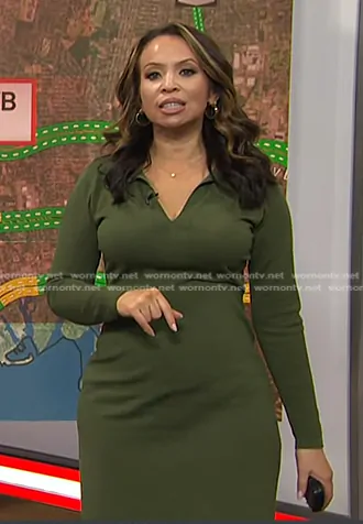 Adelle Caballero on Today on NBC was spotted wearing this green collared sweater dress on Today on Dec 11 2024's episode. Adelle's Dress is the Mini Sweater Dress by Ronny Kobo Collective.