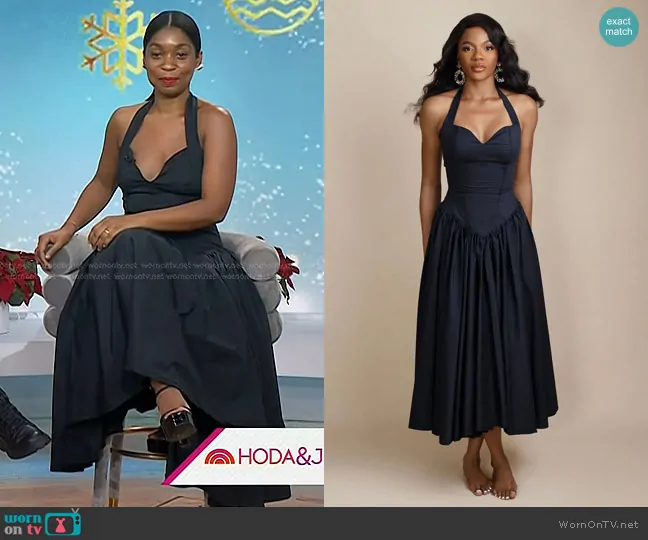 on Today on NBC was spotted wearing this black halter neck midi dress on Today on Dec 11 2024's episode. 's Dress is the Jo-Ellen V Drop Waist Halter Neck Maxi Dress by Kaiiko x Virgo.