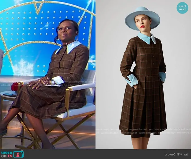 Deborah Roberts on Good Morning America on ABC was spotted wearing this brown plaid dress on Good Morning America on Dec 12 2024's episode. Deborah's Dress is the Mae Collared Dress by Behida Dolic Millinery.