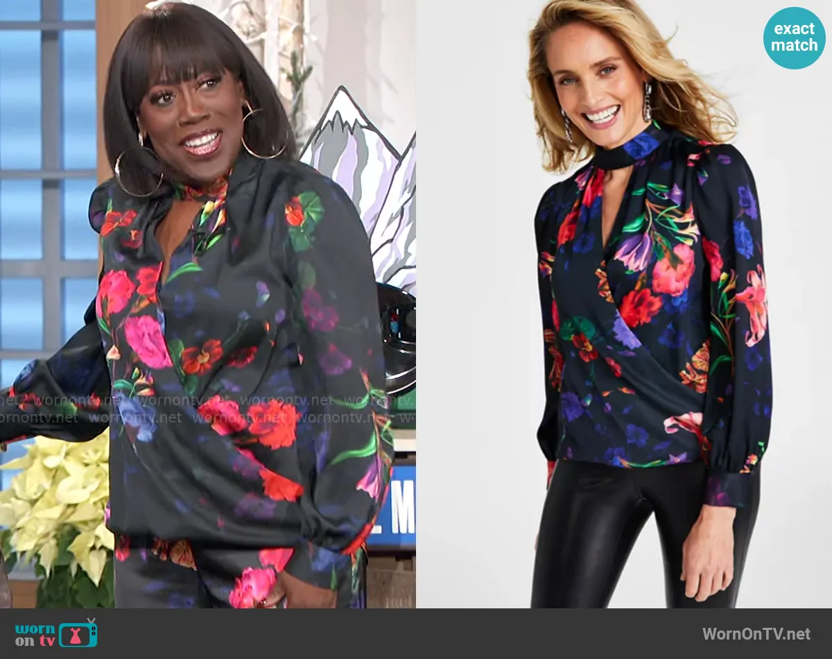 Sheryl Underwood on The Talk on CBS was spotted wearing this floral blouse and pant set on The Talk on Dec 12 2024's episode. Sheryl's Top is the Printed Cutout Surplice-Neck Blouse by INC International Concepts . Sheryl's Pants is the Wide-Leg Satin Pants by INC International Concepts.