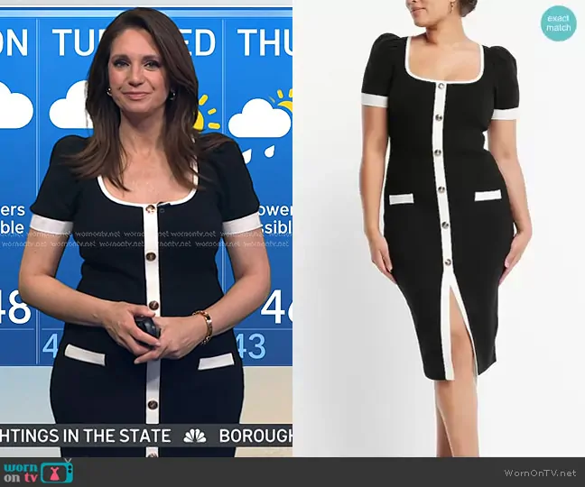 Maria Larosa on Today on NBC was spotted wearing this black button front dress with white trims on Today on Dec 16 2025's episode. Maria L's Dress is the Scoop Neck Puff Sleeve Novelty Button Tipped Midi Sweater Dress by Express.