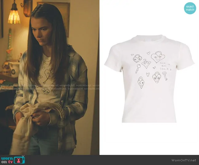 Emily Morgan (played by Chloe East) on No Good Deed on Netflix was spotted wearing this white heart print tee on No Good Deed on episode 'Best and Final' (1x07) in Dec 2024. 's Top is the 90s Hearts Cotton Baby Tee by Re/Done . 's Shirt is the Hunter Plaid Button-Up Shirt by Rails.